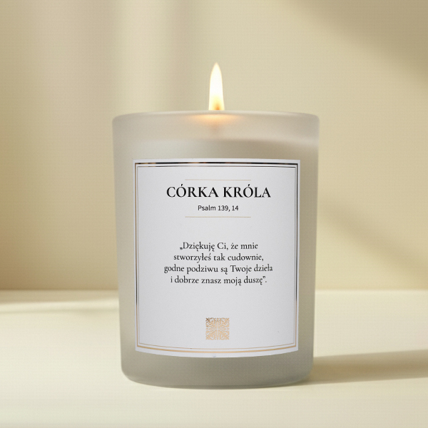 Przeznaczenie: „Córka Króla” to świeca, która podkreśla niezwykłą godność dziecka Bożego – umiłowanej córki samego Stwórcy. Jej światło niesie pokój, piękno i siłę płynącą z Boże miłości. "Córka Króla" to symbol światła, które przypomina o Twojej wartości. W jej płomieniu odbija się piękno, delikatność i moc pochodząca od samego Stwórcy.