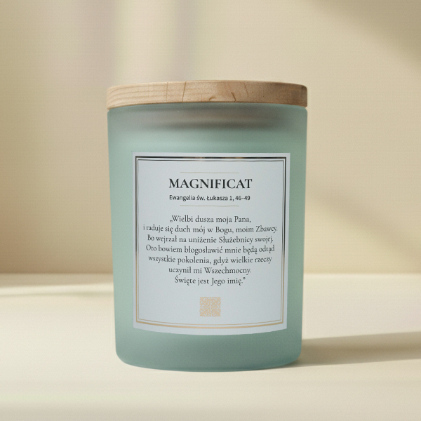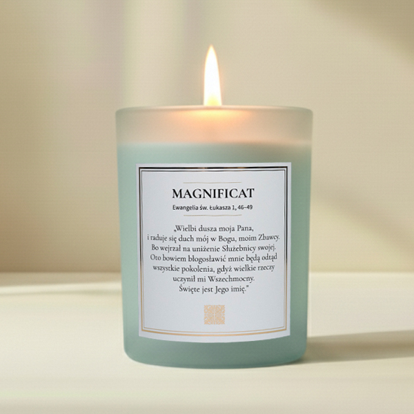 Przeznaczenie: „Magnificat” to świeca uwielbienia i wdzięczności, wzorowana na modlitwie Maryi. Jej płomień przypomina, że Bóg czyni wielkie rzeczy także w naszym życiu, jeśli Mu ufamy. Idealna na szczególne momenty – sakramenty, jubileusze, rocznice – lub jako osobisty znak dziękczynienia za Boże błogosławieństwa. To świeca radości i wielbienia, która rozświetla codzienność.