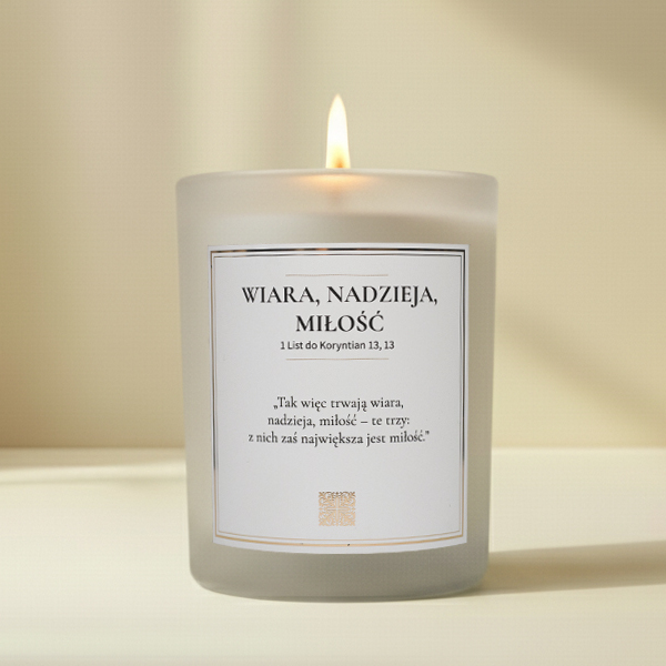 Przeznaczenie: Ta świeca symbolizuje trzy filary życia chrześcijańskiego. Jej blask przypomina, że wiara prowadzi do zaufania Bogu, nadzieja niesie światło w niepewności, a miłość – największa z cnót – trwa na zawsze. Idealna na ślub, rocznicę, jubileusz lub jako prezent duchowy – znak, że życie zakorzenione w tych trzech wartościach przynosi pełnię.